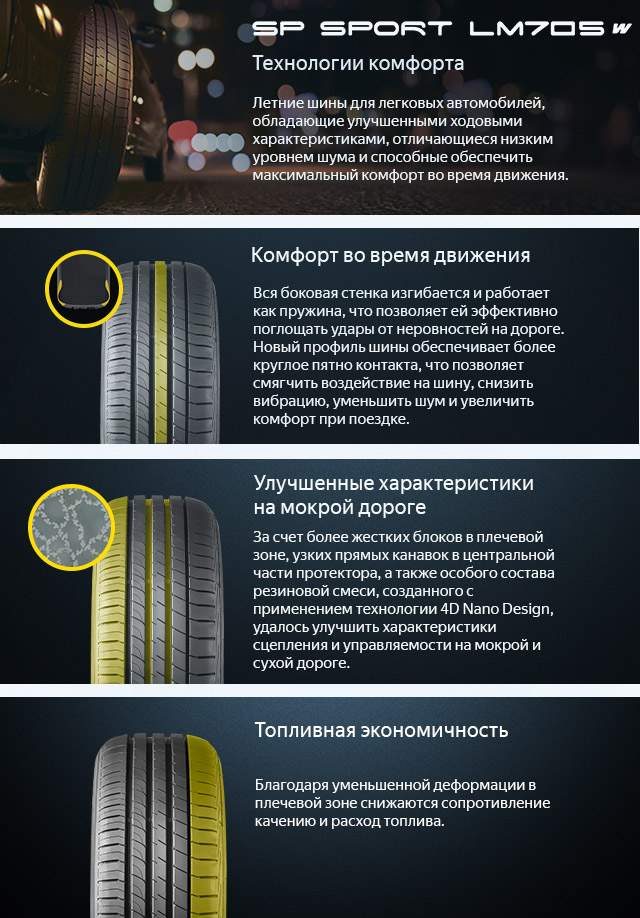 Dunlop SP Sport LM705W- летние легковые шины повышенной комфортности. Шина идеально подходит для использования как на городских улицах, так и на скоростных автомагистралях, и обладает сбалансированными ходовыми характеристиками, длительным сроком службы и улучшенными характеристиками управляемости.